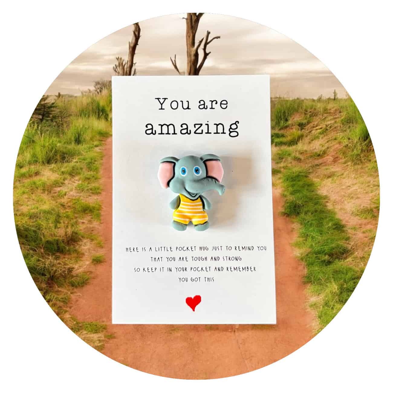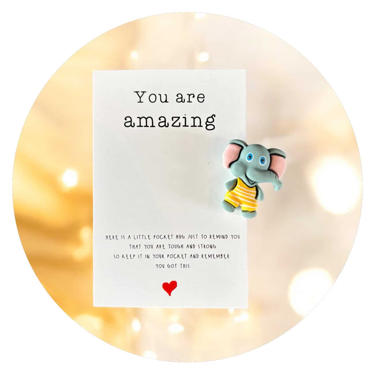 Deze Pocket Hug olifant met de tekst You are amazing is een liefdevol en vrolijk cadeautje om iemand te steunen of te waarderen. De olifant staat symbool voor kracht, trouw en geluk, waardoor dit figuurtje perfect is als troostcadeau, als bedankje of als klein teken van waardering.