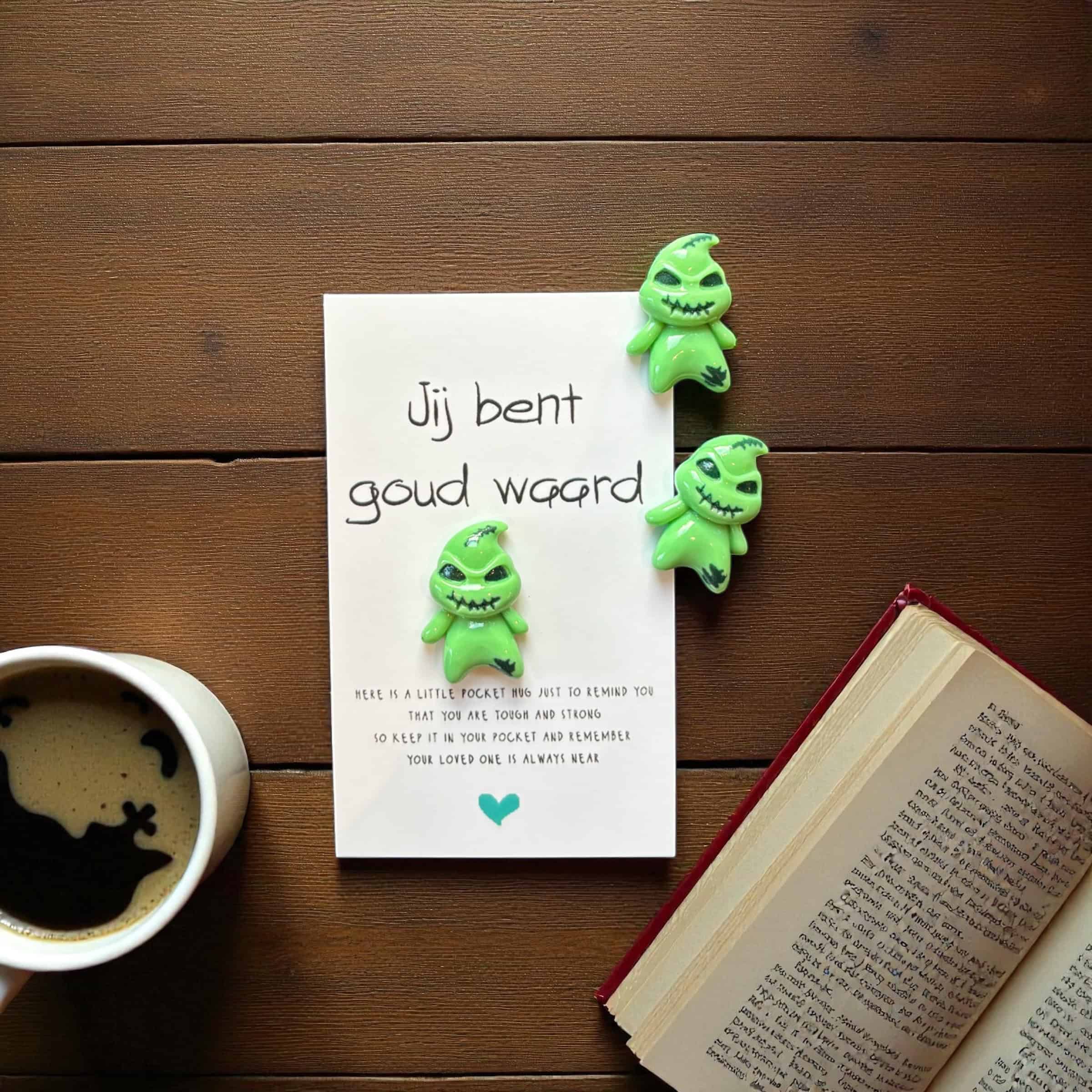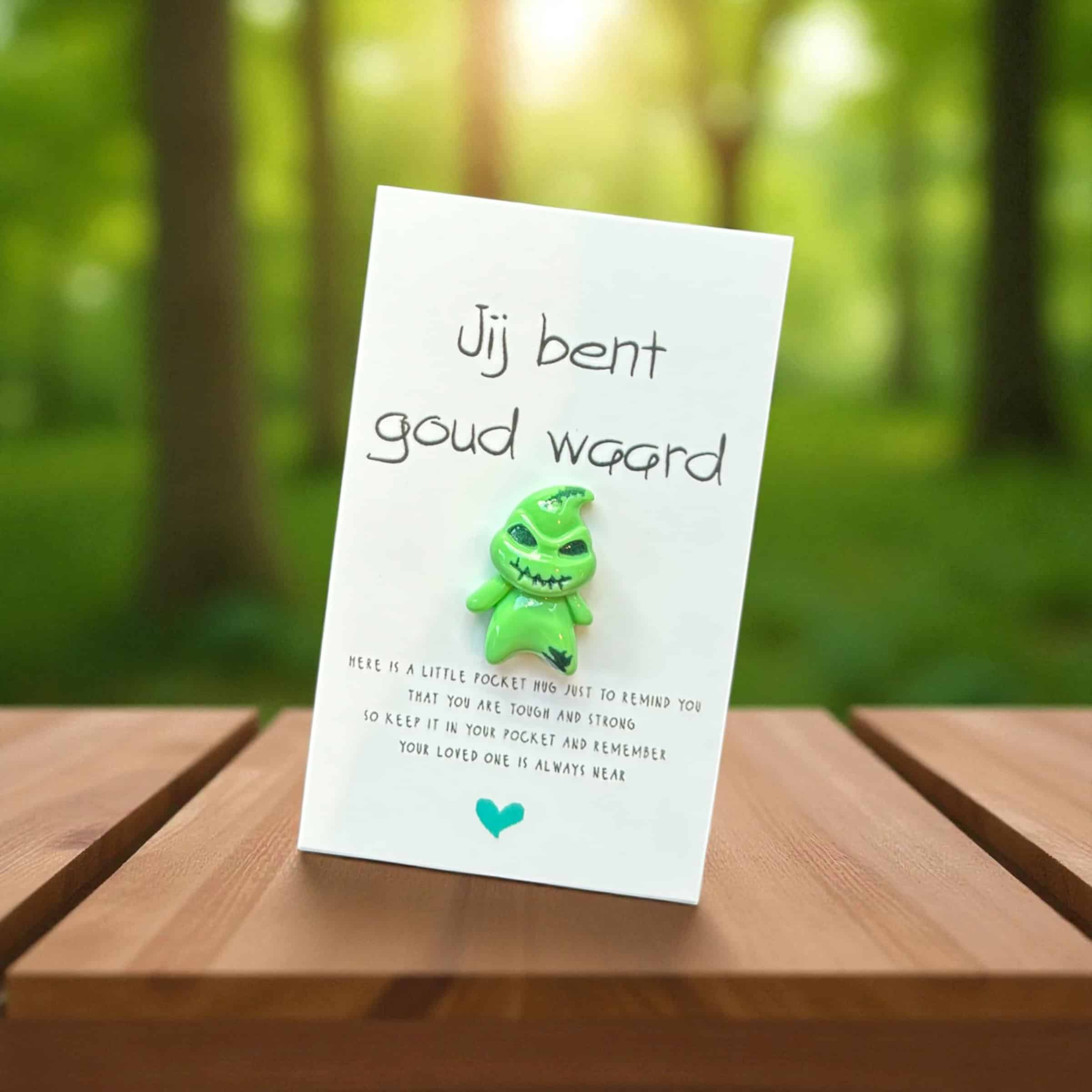 Wat dit Groene Griezeltje zo bijzonder maakt, is de combinatie van speelsheid en betekenis. Het is geen zwaar troostgeschenk, maar ook zeker geen luchtig grapje. Het zit daar precies tussenin — op dat punt waar een klein cadeautje ineens veel meer wordt dan dat. Een betekenisvol cadeau dat zegt: ik zie jou, zonder dat je daar een heel gesprek voor hoeft te voeren.