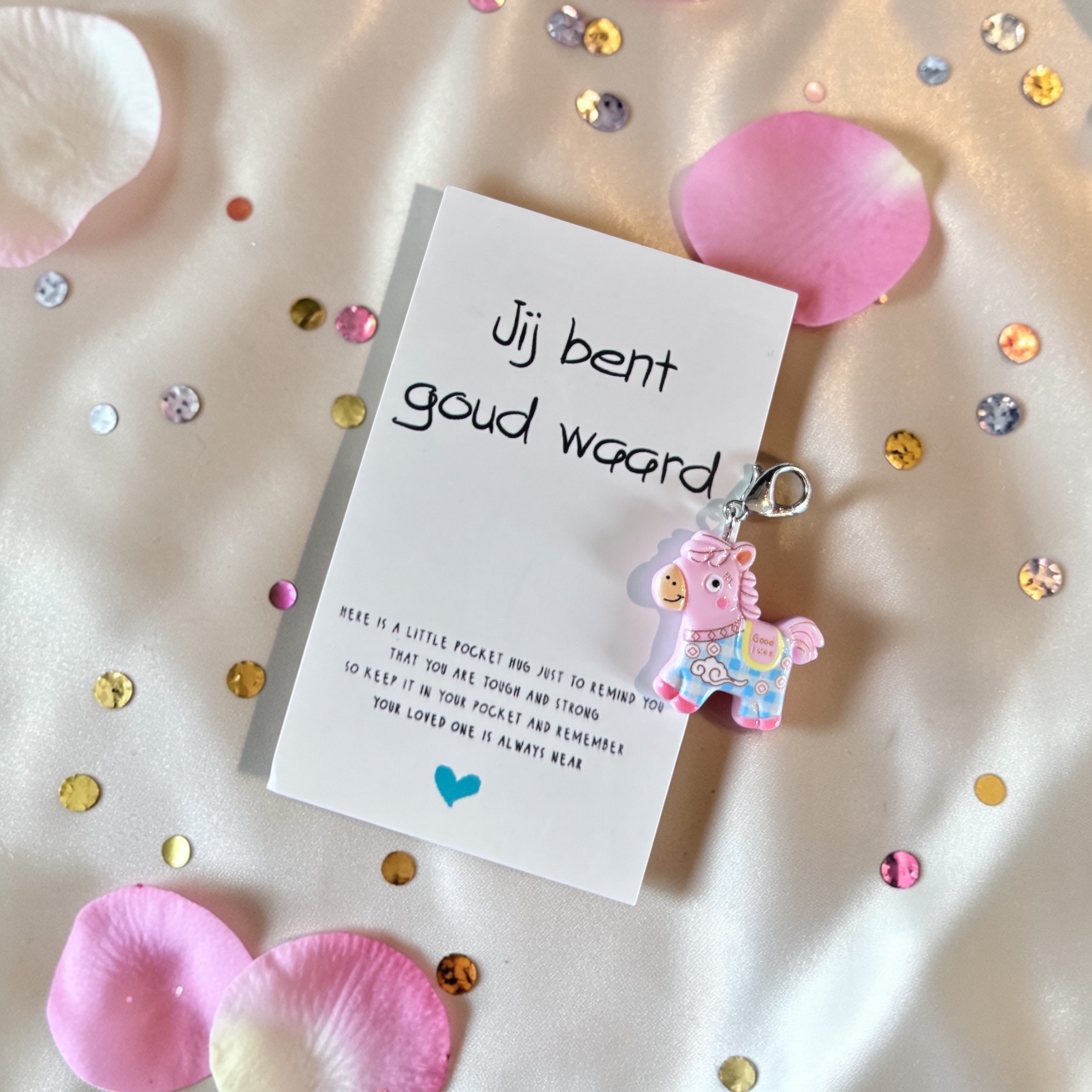 Deze lieve pony – of paardje, net hoe je het noemt – draagt een boodschap die precies raakt waar het nodig is: “Jij bent goud waard.”