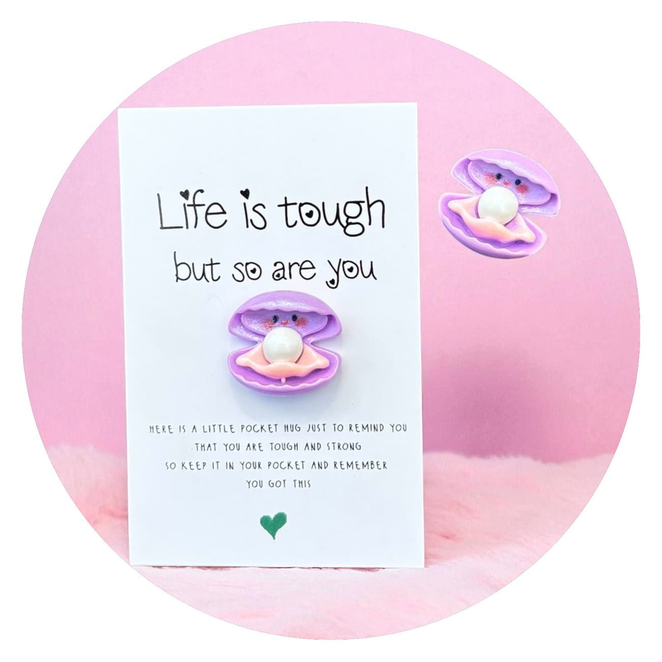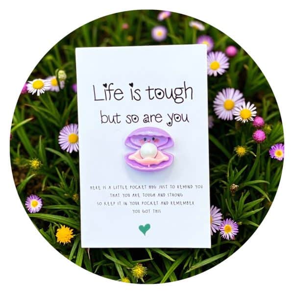Soms heeft iemand gewoon even een herinnering nodig aan hoe sterk hij of zij eigenlijk is. Deze pocket hug in de vorm van een paarse schelp met een wit pareltje zegt precies dat, met het kaartje waarop staat: “Life is tough but so are you.”
