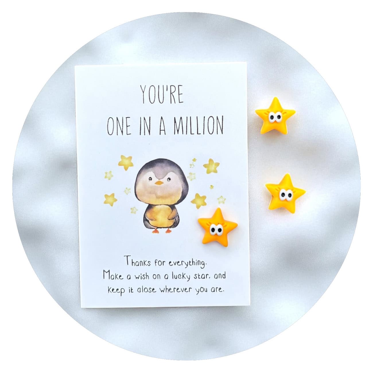 Aan dit sterretje hangt een kaartje met de tekst “You’re one in a million”. Op het kaartje staat een lieve pinguïn afgebeeld — niet als figuurtje zelf, maar als beeld dat de boodschap versterkt. De pinguïn staat bekend om trouw, zachtheid en samen zijn. In combinatie met het sterretje vertelt het kaartje een helder verhaal: jij bent uniek, precies zoals je bent, en iemand ziet dat.