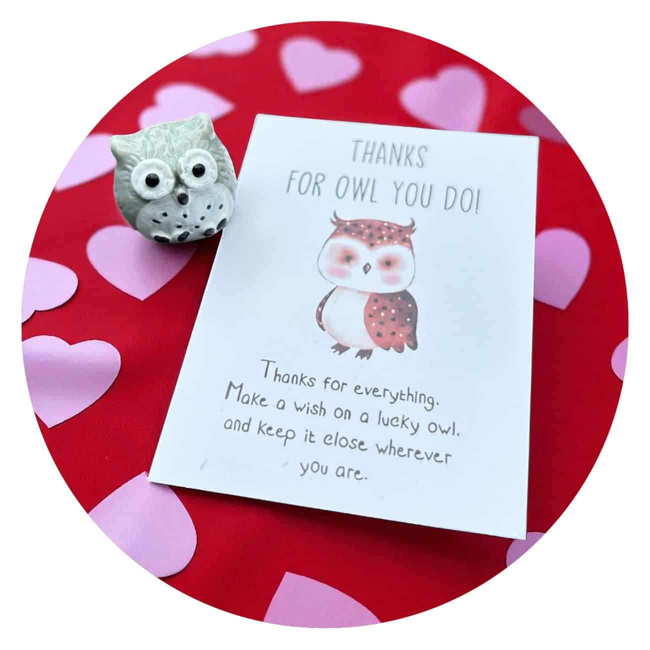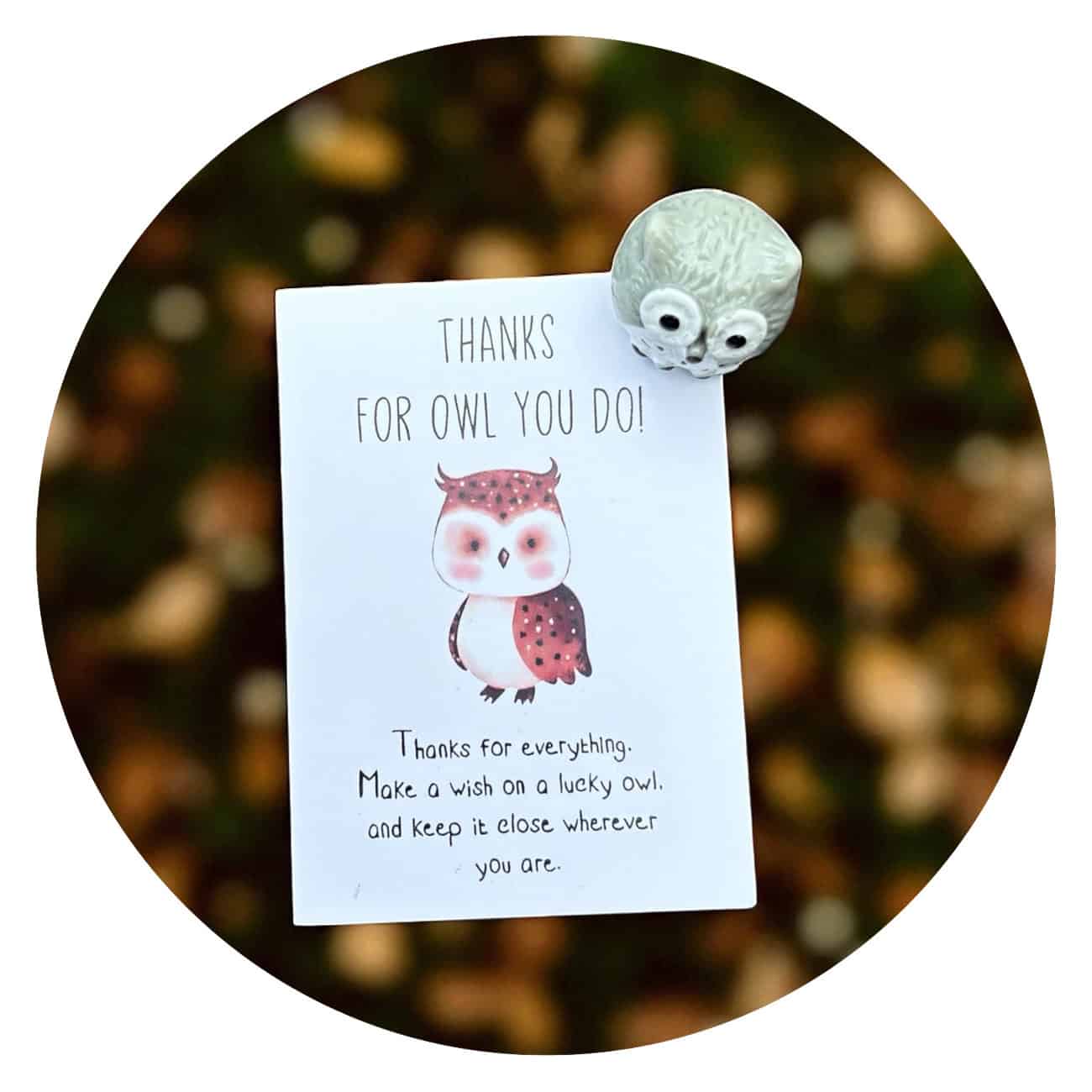 Aan dit uiltje hangt een kaartje met de tekst “Thanks for owl you do”. Een speelse woordspeling, licht en liefdevol, die het bedanken minder zwaar maakt maar juist warmer. Het zegt: ik zie wat je doet. Ik waardeer het. En ik wil dat je dat weet. Zonder lange uitleg, zonder groot gebaar.