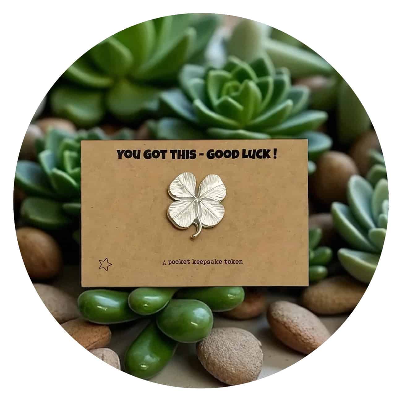 Soms is een klein beetje geluk precies wat iemand nodig heeft. Dit glanzende klavertje vier is zo’n geluksvriendje in zakformaat. Met zijn warme uitstraling en het kaartje You got this – Good luck! vormt het een krachtig gebaar van steun en vertrouwen.